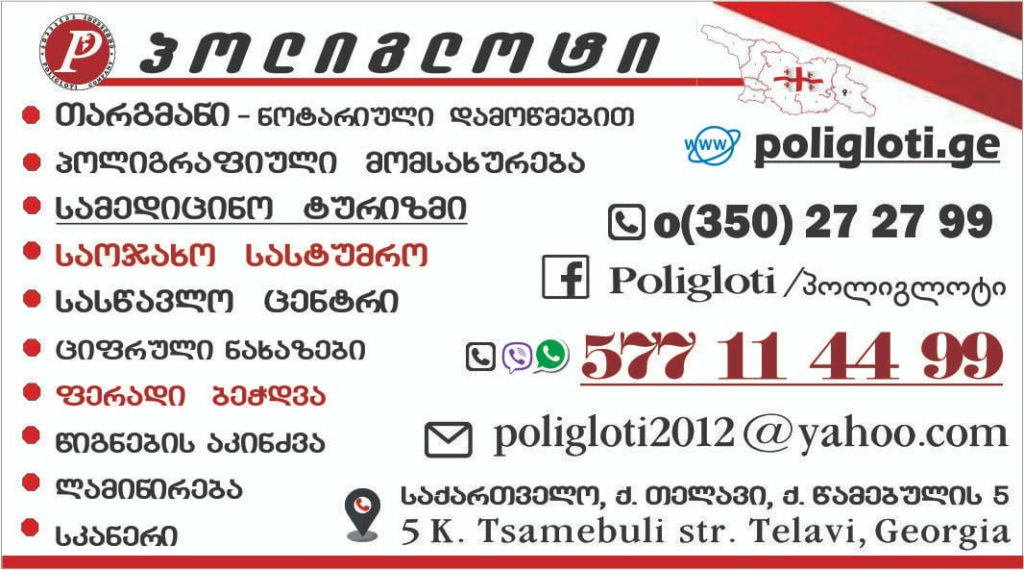 თუ ფლობ უცხო ენას, ხარ პასუხიმგებლიანი ადამიანი და დაინტერესებული ხარ მომსახურების სფეროში მუშაობით . გამოაზავნე CV ელ. ფოსტაზე poligloti2012@yahoo.com